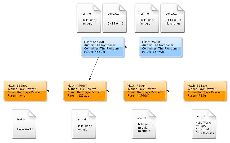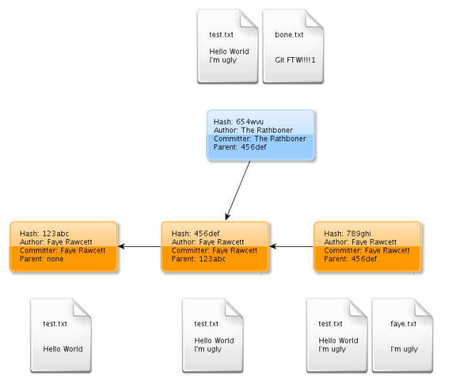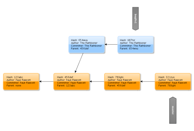 OK, so you understand what commits are and how they relate to other commits with the parent hash IDs. Now you might be thinking that it sounds remarkably similar to svn changesets, and you’d be right up until this point. Now what if I told you that each commit can have multiple parents and descendants? If you consider the case where the second commit from our previous example has two descendants then you have the beginnings of branches! In other words we can have two commits that have the same parent which effectively forks the history: