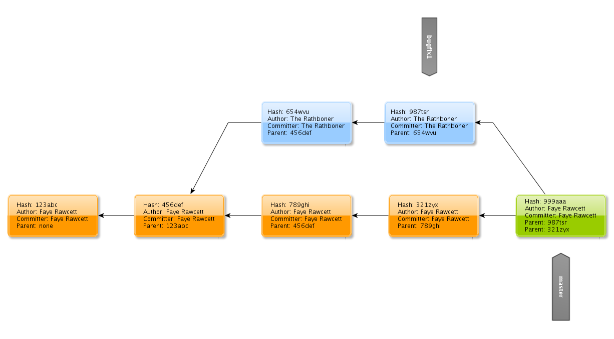 While is it possible to get git to do this it could actually use a fast-forward merge in this case. Git sees that nothing has happened in the master branch during the life of the bugfix2 branch and realises that the history is actually linear. So all git does is move the master branch pointer to the same commit as the bugfix2 pointer (i.e. commit 987tsr), like so:
