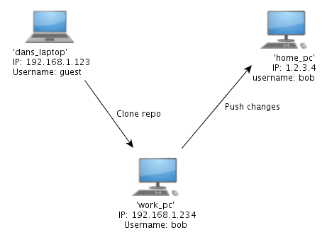 So what is git push? Well first we need to know a bit about how git tracks ‘other’ repos. Let’s say you cloned the framework repo from github. Git will remember where you cloned the repo from so you can utilise the info later on to push changes back out. But because git is distributed you could have cloned the repo from anywhere, from anyone. For arguments sake lets say you cloned the framework repo from my laptop onto your work PC, then you did some work on it and wanted to push the changes to the repo on you PC at home so you could continue while you are working from home. There are 3 repos involved here and git tracks all of them as ‘remotes’. A remote is essentially just a label to refer to another copy of the repo (potentially) on another machine. From the point of view of your work PC there are two ‘remotes’: